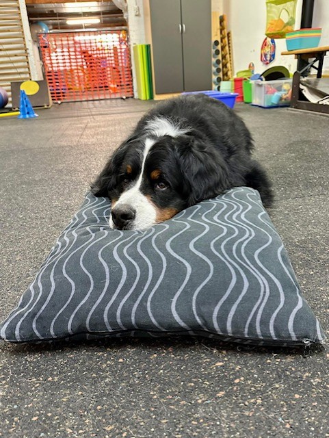 Mo, ein Berner Sennenhund-Rüde, kommt mit Frauchen ins Happy-Mix und macht eigentlich alles gerne. Hier übt er gerade "Kinn" - den