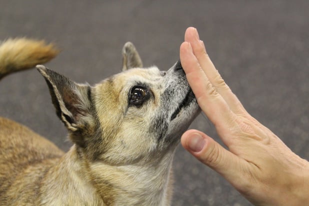 Indy, eine Chihuahua-Mix Hündin, ist regelmässig im Trickdogging und dadurch ein richtiger Profi!! Sie liebt das "Tricklen" über alles und zeigt hier sehr schön das "nose" - länger an der Hand andocken..... :-)