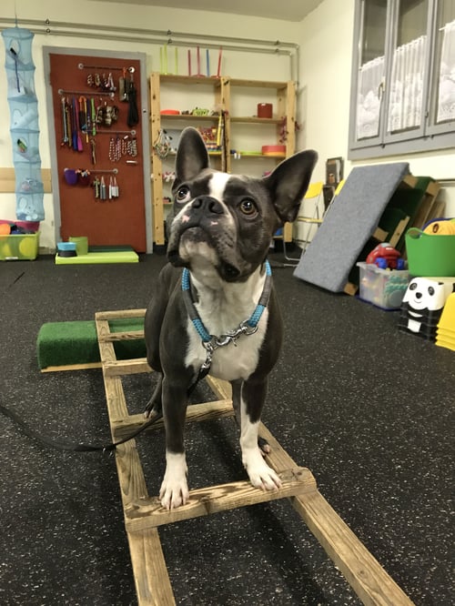Djambo ist ein Boston Terrier und besucht mit Frauchen den Happy-Mix Kurs.