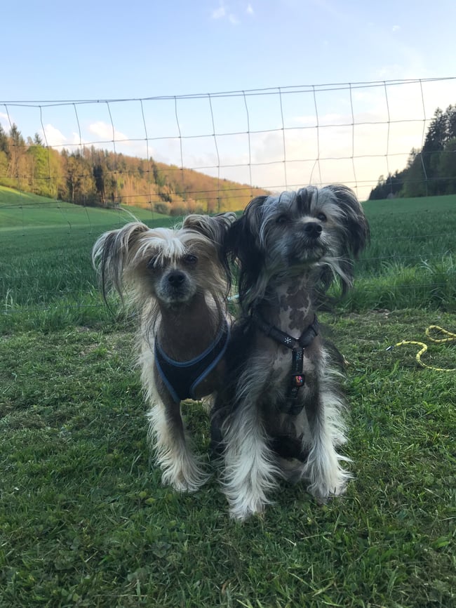 Die zwei süssen chinesischen Schopfhunde beim Warten im Plausch-Agility.