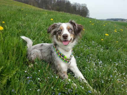 Meine "Mayla", Mini -Aussie, begleitet mich seit 1 1/2 Jahren durchs Leben und bringt mich jeden Tag aufs Neue durch ihre drollige, aufgestellte Art zum Lachen. Der quirlige, charmante ♥Gute-Laune-Hund♥ mag alle Leute, alle Hunde und setzt ihr typisches Aussie-Grinsen auf.