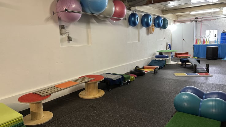 In meinem Übungsraum (130 m2) mit rutschfestem Boden aus Gummischrotmatten, stehen verschiedene Geräte und Requisiten für ein vielseitiges und abwechslungsreiches