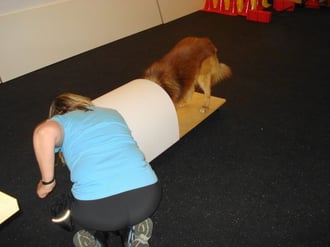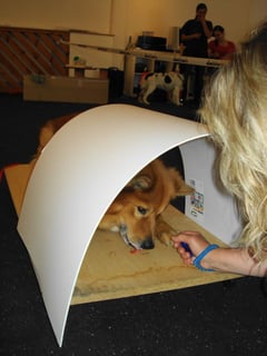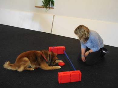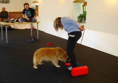 Level 2: Der Hund steigt in den Bob ein, setzt oder legt sich hin und nimmt den Kopf nach unten, dann fährt der Bob.