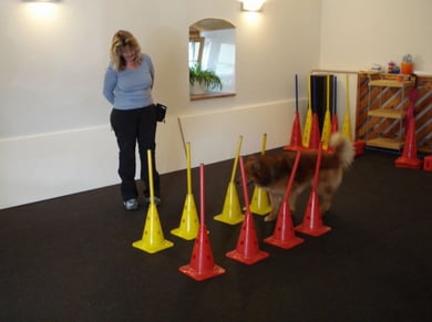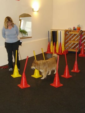 Level 1: Der Hund geht selbständig durch 3-4 Slalomtore in gerader Linie, der Mensch bleibt an einer Position stehen.